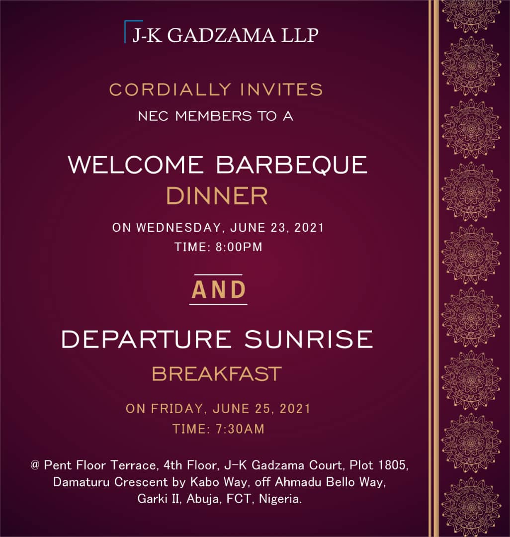 Joe-Kyari Gadzama, SAN a former Chairman of the Nigerian Bar Association (NBA) Abuja Branch has invited NBA-NEC Members arriving today Wednesday, 23 June, 2021 for the NBA-NEC Meeting to a Welcome Barbeque Dinner & Dance this evening by 8:00 pm at the Pent Floor Terrence, 4th Floor, J-K Gadzama Court, Plot 1805, Damaturu Crescent by Kabo Way, Off Ahmadu Bello Way, Garki 2, Abuja.