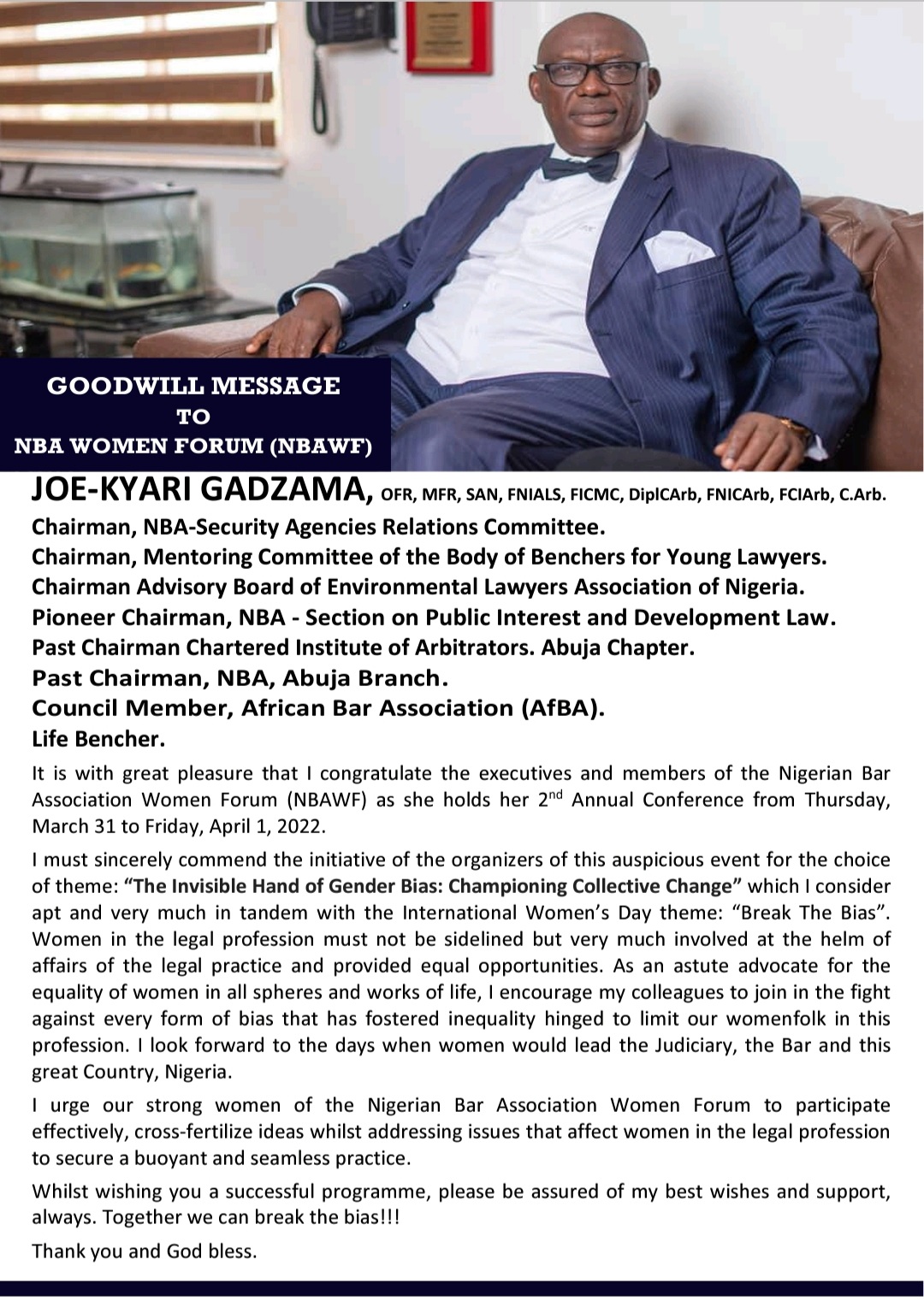 The Chairman of the Nigerian Bar Association (NBA) Security Agencies Relations Committee, Chief Joe-Kyari Gadzama SAN has felicitated with the NBA Women Forum on its 2nd Annual Conference.