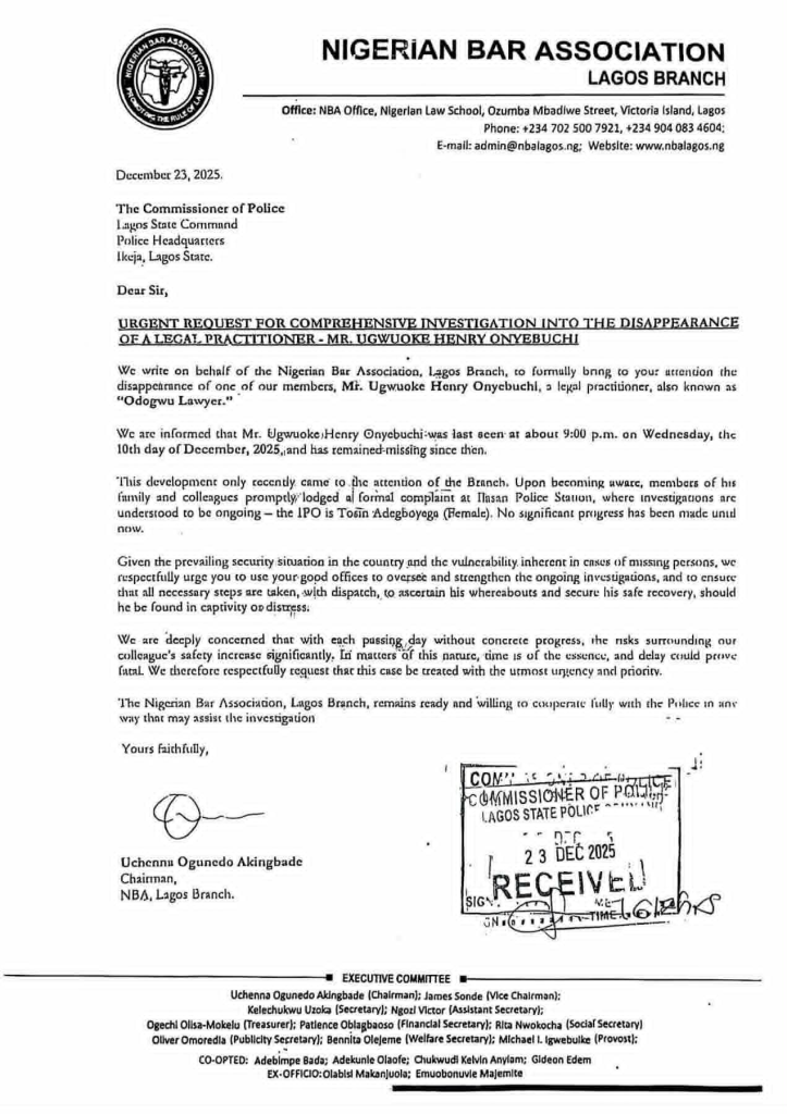 NIGERIAN BAR ASSOCIATION, LAGOS BRANCH CALLS FOR URGENT ACTION OVER MISSING LAWYER