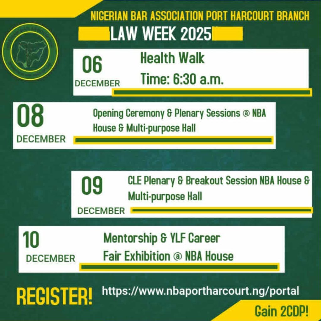 NIGERIAN BAR ASSOCIATION, PORT HARCOURT 2025 Law Week be held from Saturday, 6th December to