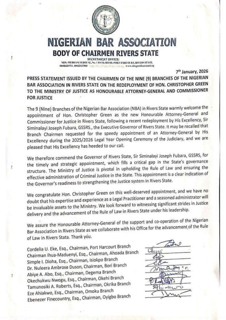 The Nigerian Bar Association (NBA) under the aegis of “NBA Body of Chairmen Rivers State” has commended Rivers State Governor Siminalayi Fubara on the appointment of Hon. Christopher Green as the new Attorney-General and Commissioner for Justice for the state.