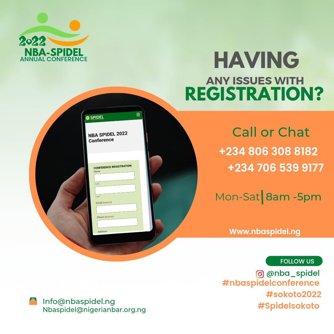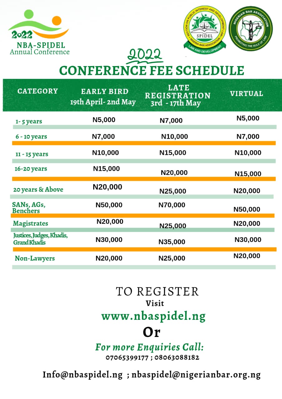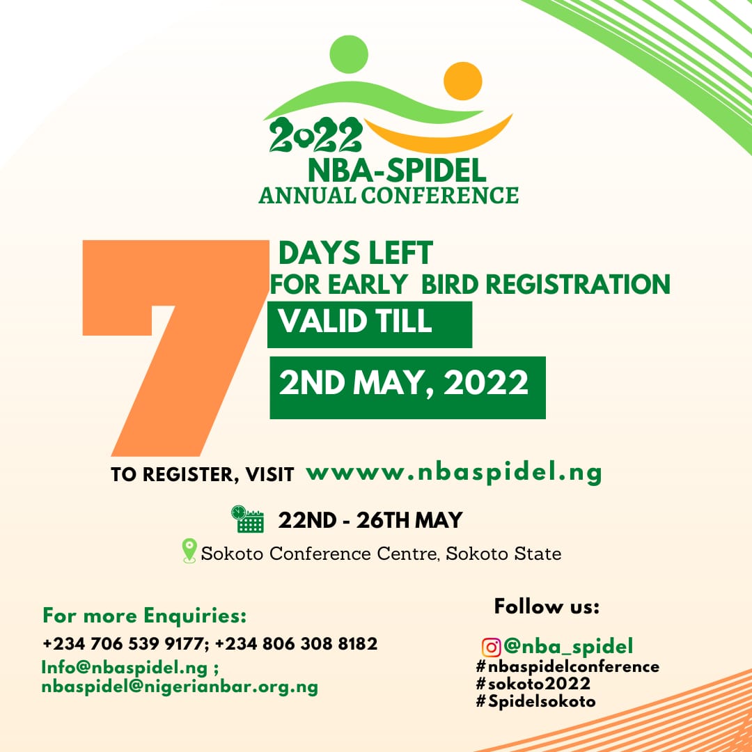 The Nigerian Bar Association (NBA) has urged lawyers and the general public to ensure that they use the Early Bird window to register for the eagerly awaited NBA Section on Public Interest and Development Law (SPIDEL) Annual Conference.