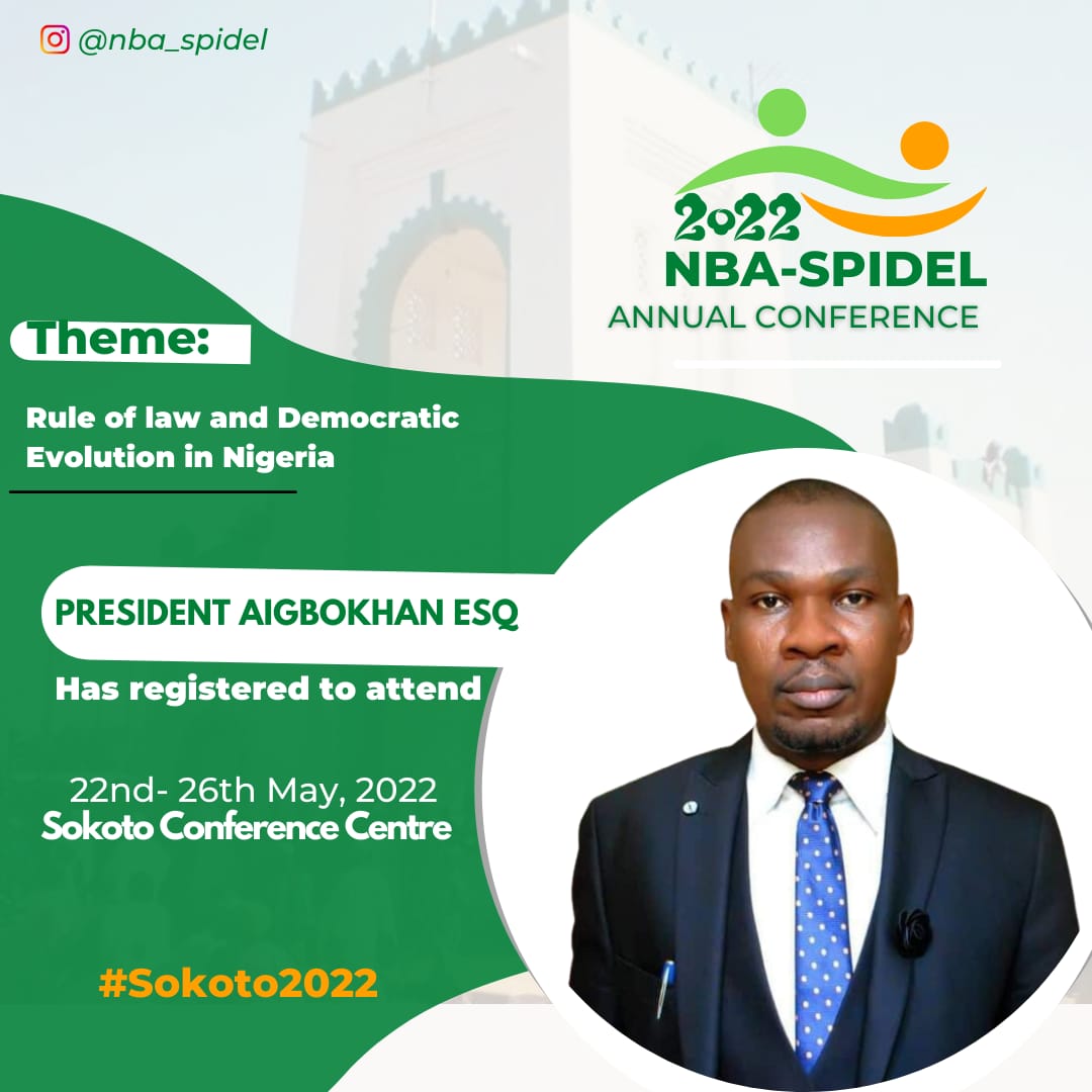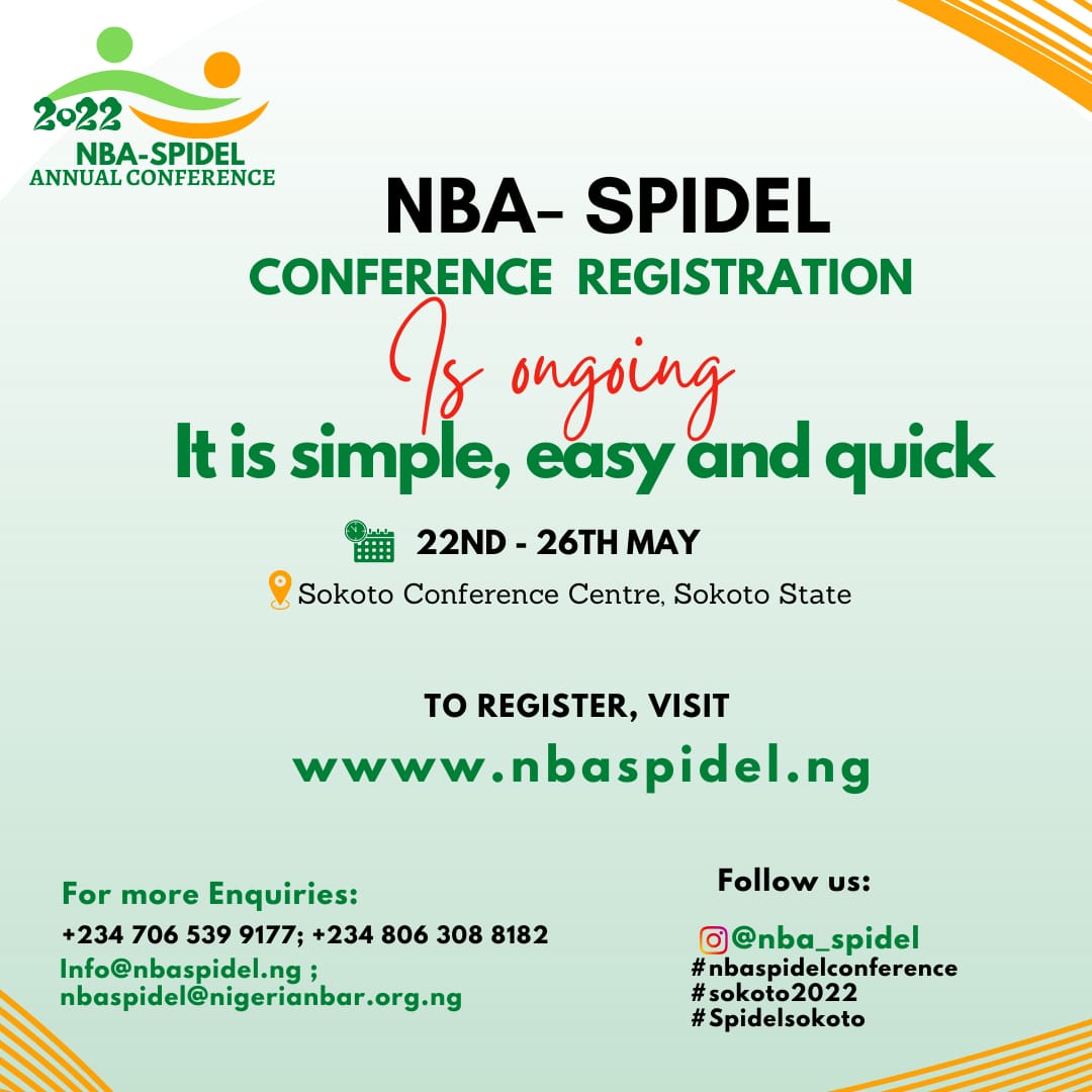 In a statement by its Publicity Secretary, Dr. Rapulu Nduka, the NBA stated that lawyers are “specially invited to participate” in the NBA-SPIDEL Annual Conference scheduled to hold in Sokoto, urging prospective participants to “Kindly register through this link https://nbaspidel.ng/nba-spidel-conference-2022/.”