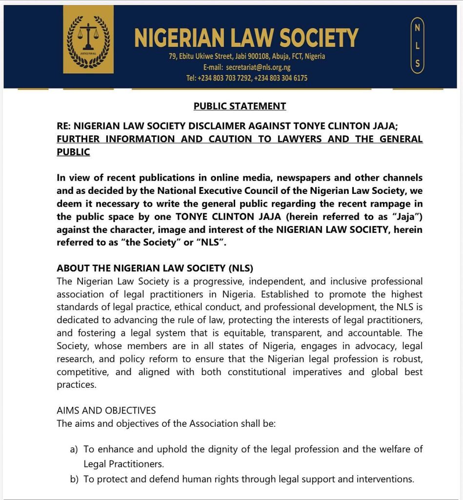 In view of recent publications in online media, newspapers and other channels and as decided by the National Executive Council of the Nigerian Law Society, we deem it necessary to write the general public regarding the recent rampage in the public space by one TONYE CLINTON JAJA (herein referred to as “Jaja”) against the character, image and interest of the NIGERIAN LAW SOCIETY, herein referred to as “the Society” or “NLS”.