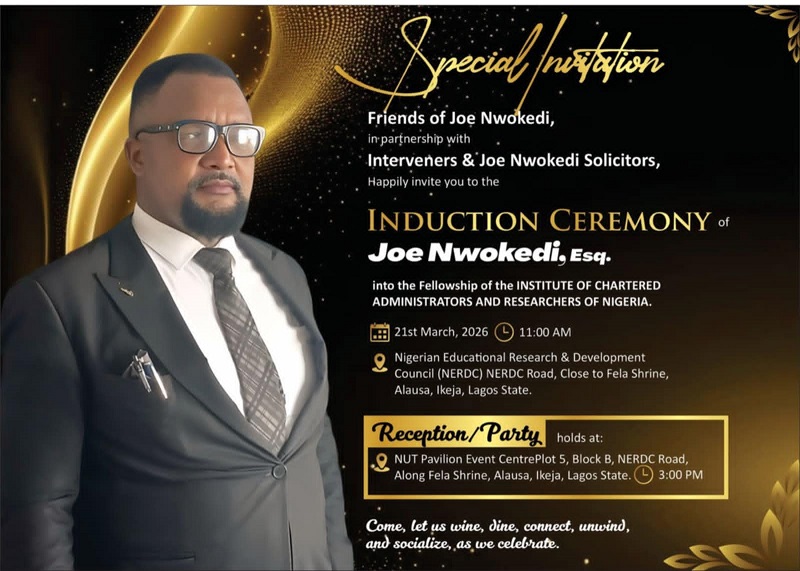 Human rights activist, Mr. Joe Nwokedi will on March 21, 2026, be inducted as a Fellow of the Institute of Chartered Administrators and Researchers of Nigeria (ICARN ).