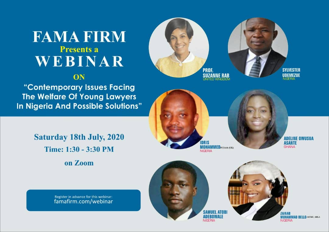 The event is a virtual conference hosted by top Kaduna based law firm, Fama Firm and titled “Contemporary issues facing the welfare of young lawyers in Nigeria and possible solutions.” The two-hour roundtable which promises to be highly engaging will kick off at 1:30 pm.